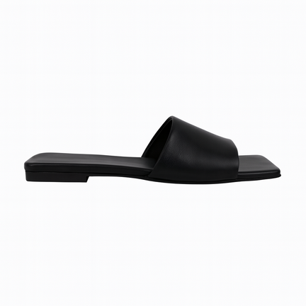 Elegant sort damesandal i ægte læder med moderne og minimalistisk design. Sandalen har et bredt vristbånd, flad sål og en stilfuld firkantet snude. Den er både komfortabel og let at bruge til hverdag, arbejde eller festlige anledninger.