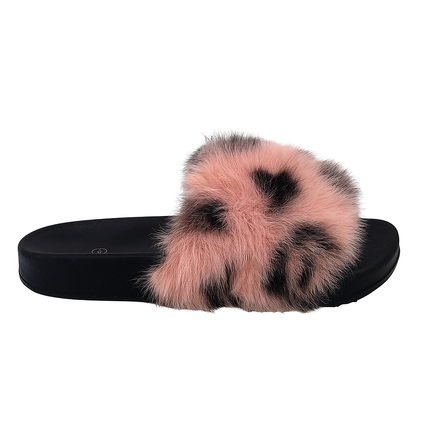 Luksuriøs dame-slipper med blød rosa kunstpels og sort leopardmønster, som giver et feminint og elegant look. Den sorte komfortable sål giver optimal støtte til både indendørs og udendørs brug. Perfekt til både afslapning og sommerbrug. Den brede pelsrem giver et sikkert og behageligt fit, mens det moderne design tilfører et strejf af eksklusivitet til ethvert outfit.