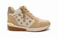 Disse stilfulde dame sneakers kombinerer sporty komfort med feminin elegance. Modellen har en skjult kilehæl, der diskret løfter og forlænger benene, samtidig med at den giver støtte og stabilitet. Skoen er udført i en lys, cremehvid farve med detaljer i beige og gyldne accenter – herunder en dekorativ lynlås og metallic hældetalje. Siderne er prydet med et diskret, grafisk blomstermønster, og ydersålen i gummi giver et solidt greb. En perfekt sneaker til dig, der ønsker stil, komfort og en smule ekstra højde.