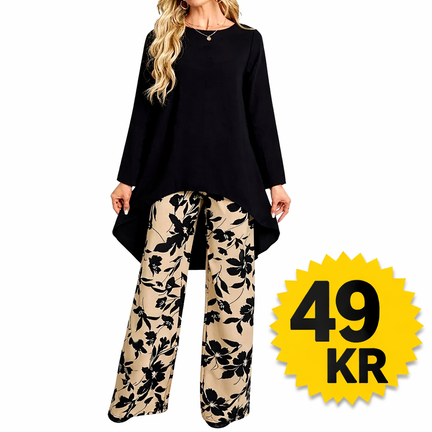 Den sorte tunika skaber et smukt fald over kroppen og giver et feminint look, mens de mønstrede bukser tilfører personlighed og stil. Et sæt der kombinerer komfort og elegance – perfekt til dig, der vil være velklædt uden at gå på kompromis med bevægelsesfriheden.
