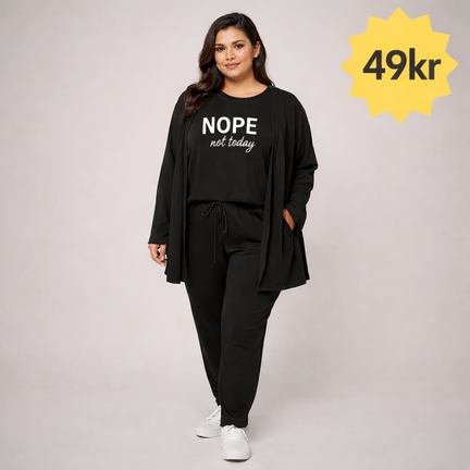 Stilfuldt og komfortabelt 3-delt damesæt i sort, perfekt til både afslapning og hverdagsbrug. Sættet består af en løs T-shirt med statement-tryk, matchende bukser med elastik og snøre i taljen samt en åben cardigan, der fuldender looket.